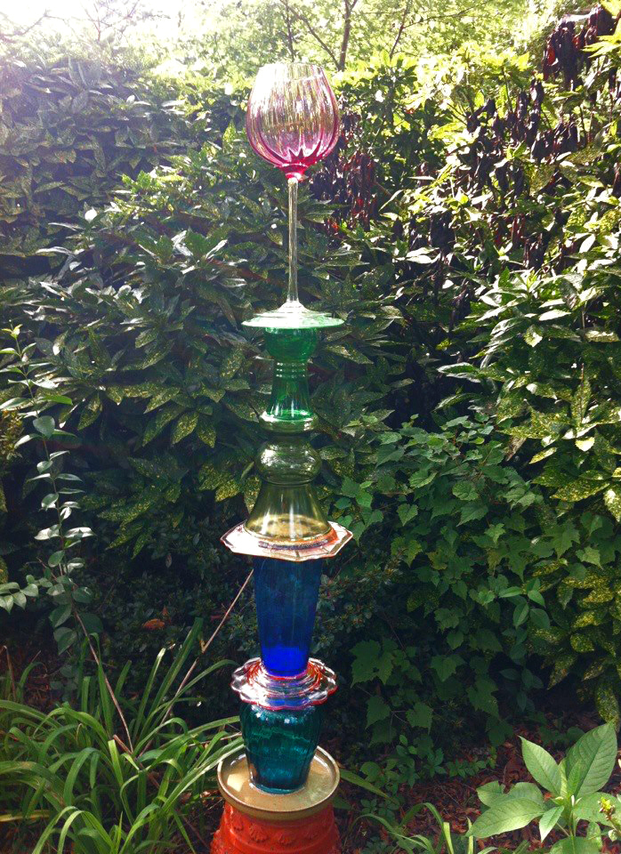 Here’s a good idea done by Tommy George for Yard Art Day. Stacked glassware – how simple and beautiful. Imagine when the light hits this piece. He’s done two – maybe more in the works.